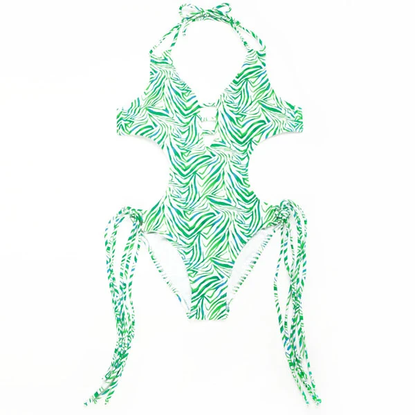 This avant-garde one piece swimsuit reimagines safari-inspired patterns with a vibrant twist, featuring electrifying green zebra stripes that create dynamic visual movement across the body. The architectural multi-strap design incorporates seven adjustable crisscrossing bands along the back and torso, crafted from contrasting matte and glossy silicone-textured straps for tactile dimension. Strategically angled stripes optically streamline the silhouette, while a plunging front neckline transitions into a high-cut leg opening to emphasize elongation.