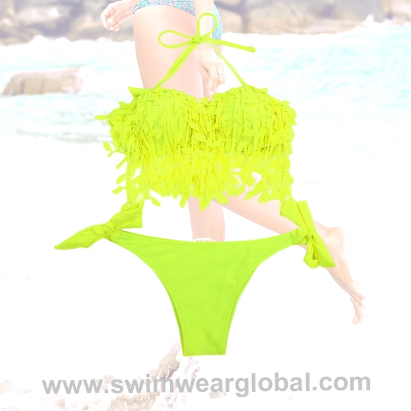 This vibrant neon yellow bikini set features playful leaf fringe detailing and a high-waisted tummy-control design, perfect for making a statement at beach parties or poolside events. Available for OEM customization.